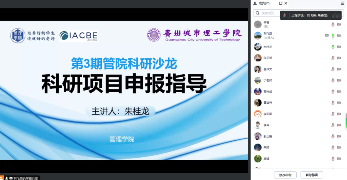 37日晚上,通过腾讯会议的方式,学院院长朱桂龙以《科研项目申报指导》为主题进行指导讲解。交流环节中,学院5名教师主动对意向申报的课题研究进行汇报,包括广东省哲学社会科学规划项目、校级青年科研基金项目、潮州市哲学社会科学“十四五”规划课题等。根据每位教师的汇报内容,朱桂龙旁征博引、举例论证,逐一进行点评指导,对教师们撰写的主题和内容提出建议和指正。他强调,做学术科研要能够有问题意识,深入融合理论与实践,注重用专业的学术术语构建研究模型,能够提出有实效、有成效的方式举措解决现实问题。