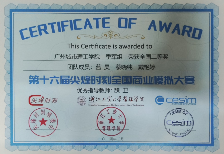 本网讯(记者 蔡晓莹 閤文峰)3月29日-31日,第十六届尖烽时刻全国商业模拟大赛总决赛在浙江杭州举行。本次大赛经过半年角逐,全国170余所院校超2000支队伍中,共有104支本科生和研究生队伍入围全国总决赛。其中,本科生组37支队伍有17所全国双一流高校,我校是入围决赛的4所民办高校之一。我校管理学院魏卫教授和閤文峰老师精心指导的“季军组”团队在本次总决赛中和南开大学、吉林大学等重点大学一起荣获本科组二等奖佳绩,在全国赛事平台展现了我校学子的风采。
