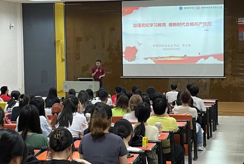 本网讯(记者 熊洲仕 邓碧聪)为深入学习贯彻习近平总书记关于党纪学习教育的重要讲话和重要指示精神,开展好学院党纪学习教育,5月9日下午,管理学院党总支书记李大章在A9-101以“加强党纪学习教育 做新时代合格共产党员”为题,为学院师生党员、入党积极分子等共计241人讲授党纪学习教育专题党课。