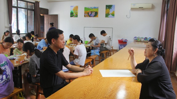 调研期间,三江县文化馆正在举办“走近非遗·匠心传承营”暑期第一课。在韦茈伊的带领下实践团来到了侗天宫,进一步了解青少年暑期学习农民画的情况。在这里,簸箕画的创始人、侗画传承人杨玉洁现场指导学生绘制农民画。孩子们手持画笔,专注地凝视着画布,一笔一划地描绘着每一个细节。