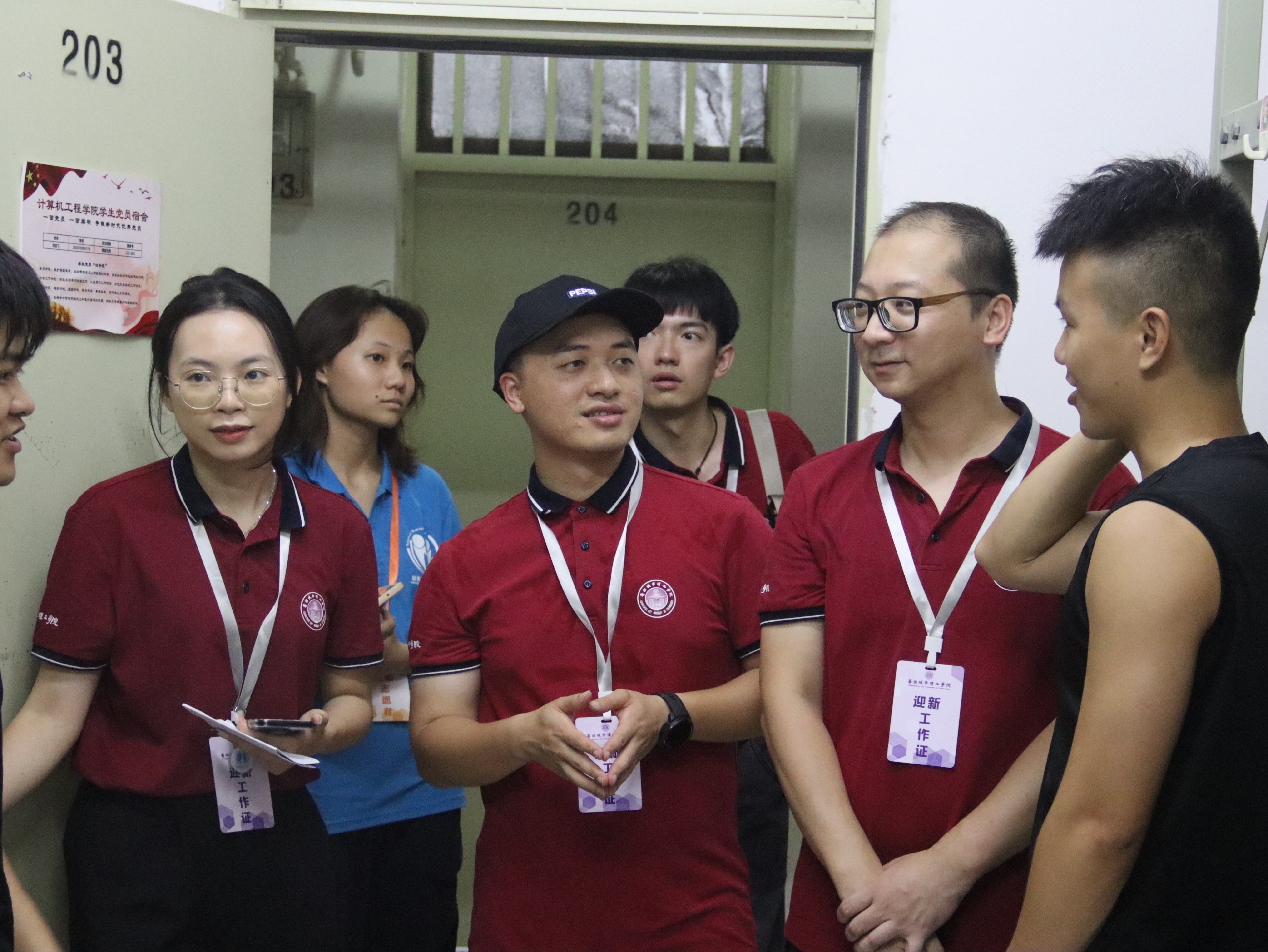 在走访新生宿舍过程中,老师们与新生们亲切交谈,关心地询问他们“来自哪里”、“是否适应新校园生活”、“是否吃过饭,可以去学校食堂品尝美食”、“未来的学习和就业打算”等问题。老师们还鼓励新生们积极融入校园生活,合理规划学业,专注学习,并提醒他们在遇到困难时要及时与班主任、辅导员沟通。在每个宿舍,老师们都特别关注宿舍设施设备的使用情况,叮嘱新生注意水电安全、保持通风、注意个人及宿舍卫生等细节。