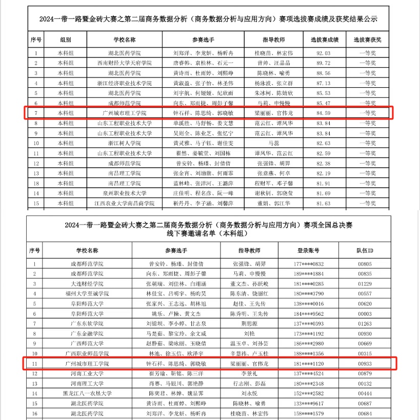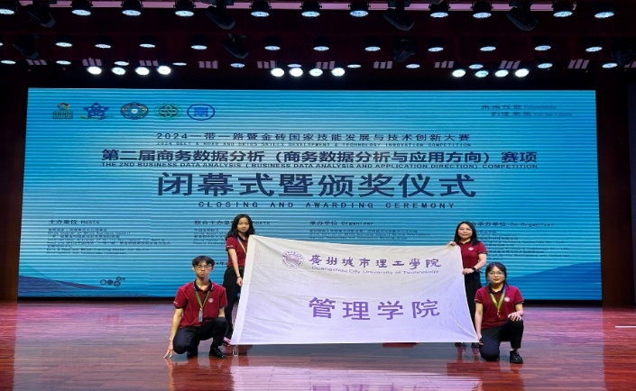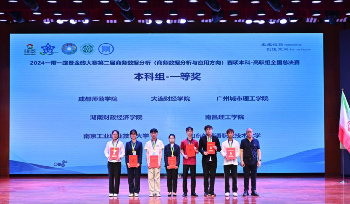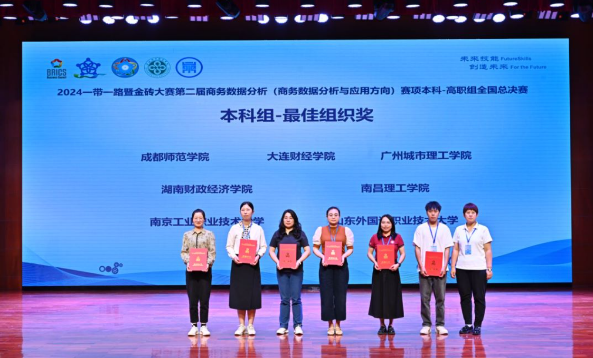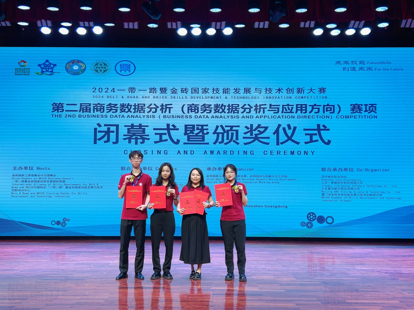 本网讯(记者 陈思绮 郭晓敏 梁丽丽)10月19日至20日,2024“一带一路”暨金砖国家技能发展与技术创新大赛第二届商务数据分析(商务数据分析与应用方向)赛项全国总决赛在深圳城市职业学院圆满落幕。我校管理学院工商管理专业的陈思绮、郭晓敏,大数据与应用专业的钟石祥组成的队伍在梁丽丽和官伟龙老师指导下,最终斩获全国一等奖。我校获本科组-最佳组织奖,指导老师获本科组-优秀指导教师。