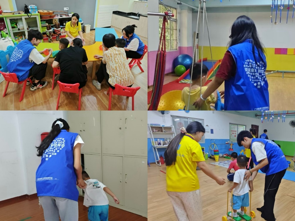 随后,志愿者们根据各自的专业背景和兴趣,参与特殊儿童的学习辅导和素质拓展活动中。他们尝试走进孩子们的世界,陪伴孩子们进行桌面教学、感统体能、音乐律动、社交游戏等课程的学习,以促进特殊儿童的感觉统合功能全面发展,增强其身体协调能力和社交能力。除此之外,志愿者们还为特殊儿童提供了生活上的帮助和支持,协助机构完成打扫教室、清洗教具、洗刷杯子等工作,为孩子们营造出一个更加整洁、舒适的学习和生活环境。