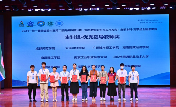 本网讯(记者 陈思绮 郭晓敏 梁丽丽)10月19日至20日,2024“一带一路”暨金砖国家技能发展与技术创新大赛第二届商务数据分析(商务数据分析与应用方向)赛项全国总决赛在深圳城市职业学院圆满落幕。我校管理学院工商管理专业的陈思绮、郭晓敏,大数据与应用专业的钟石祥组成的队伍在梁丽丽和官伟龙老师指导下,最终斩获全国一等奖。我校获本科组-最佳组织奖,指导老师获本科组-优秀指导教师。