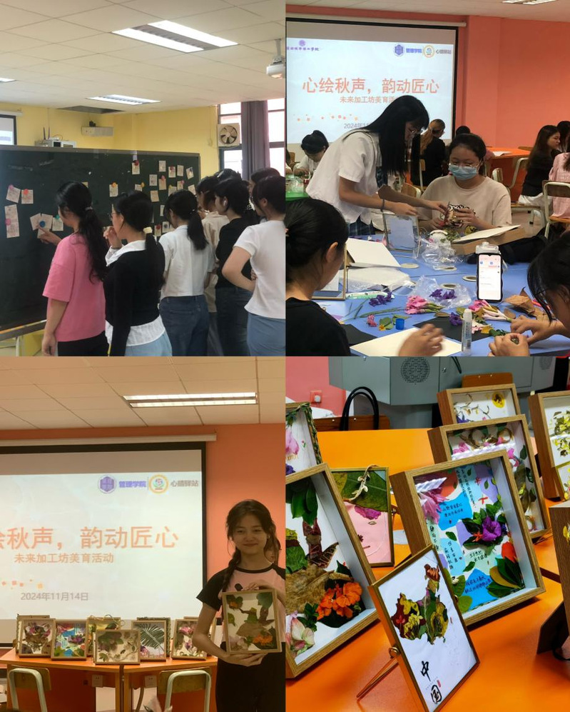 本网讯(记者 陈思婷 张泳怡)11月14日至22日,管理学院二级心理辅导站心晴驿站举行了“心绘秋声,韵动匠心”未来加工坊美育活动。本次活动吸引了众多学生参与,旨在让同学们感受自然之美、生活之美,聆听内心之音,共探秋秘,增进心理健康。
