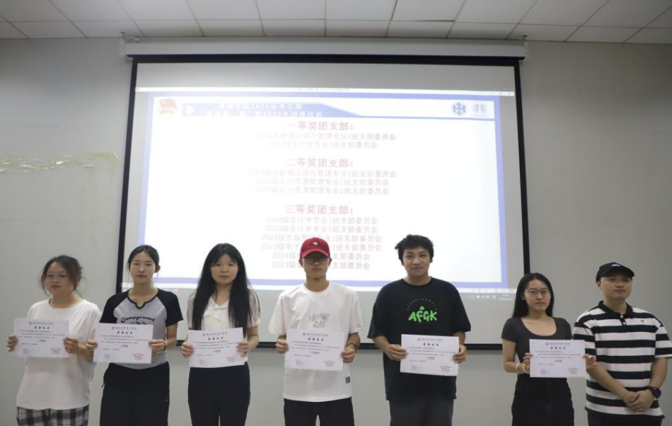 活动尾声,对2024—2025学年管理学院团日活动竞赛获奖团支部进行表彰,由学院团委副书记蔡锭宇为学生代表颁发获奖证书,并与获奖支部代表合影留念。