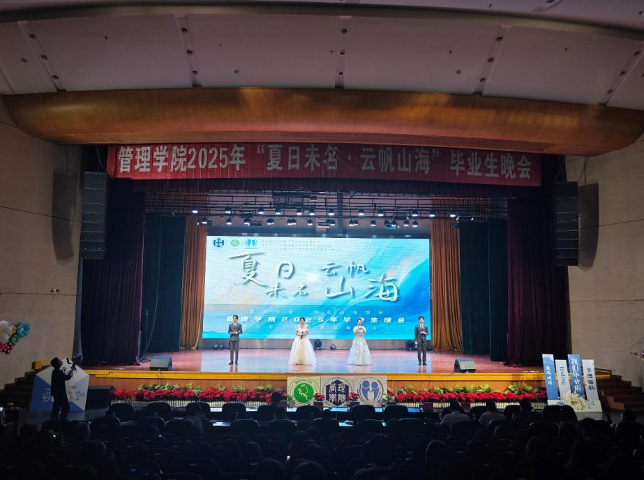 本网讯(记者 符嘉煜 姚焮月 应澎)为展现学子青春风采,营造温馨的毕业文化氛围,管理学院于5月8日晚在学生活动中心举行2025届“夏日未名·云帆山海”毕业生晚会。学校后勤处处长李大章、管理学院领导班子以及毕业班师生参加此次晚会。
