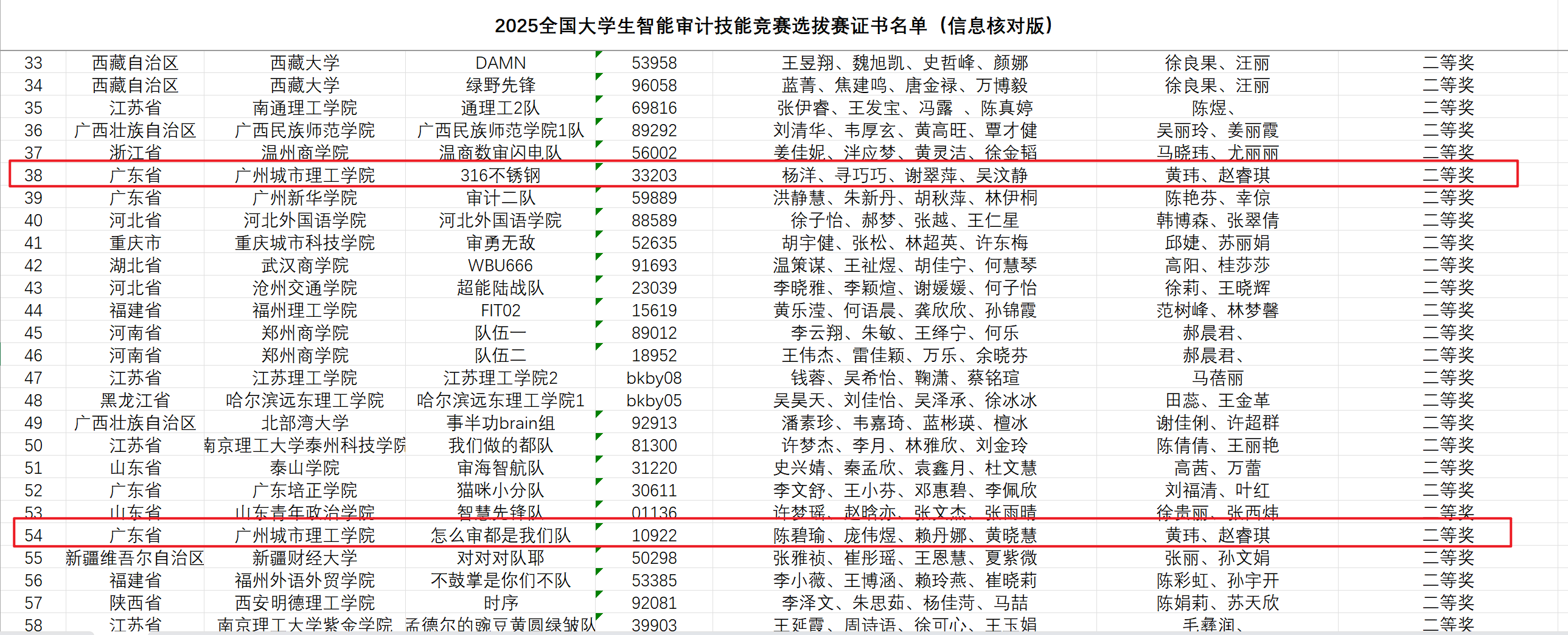 本网讯(记者 黄玮 赵睿琪)5月10日,2025年全国大学生智能审计技能竞赛全国选拔赛圆满收官。我校管理学院会计系选派的两支参赛队伍凭借团队合作精神与出色的智能审计实操能力,在全国26个省(区、市)上百所高校的250余支队伍中脱颖而出,两支队伍均荣获全国选拔赛二等奖,展现了我校在智能审计领域的培养成效。