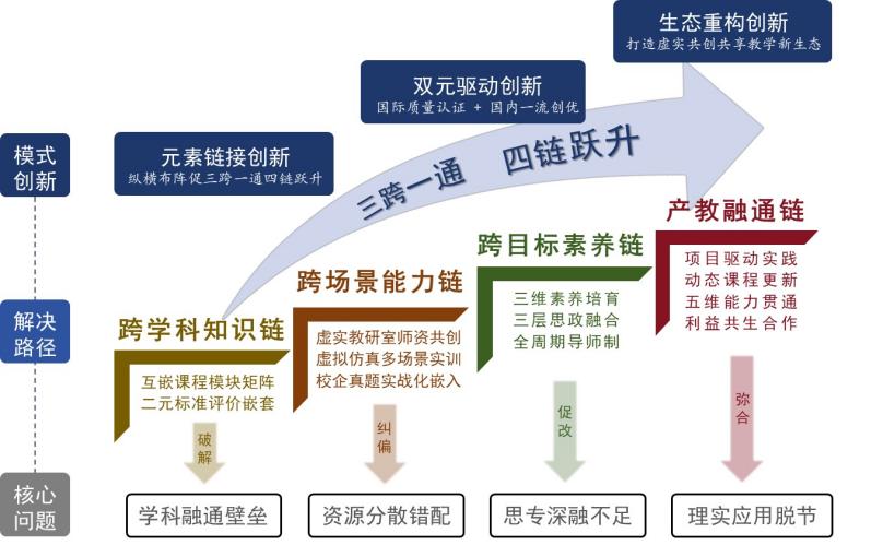 根据布鲁姆教育目标理论、协同效应理论和共创共生理论,学院构建了“三跨一通”驱动“知识奠基→能力锻造→素养内化→产业反哺”螺旋跃升的模式,推动人才培养从知识奠基到最终的产教融合的跃升。这一模式通过跨学科知识链打破壁垒,使不同的学科进行交叉融合。