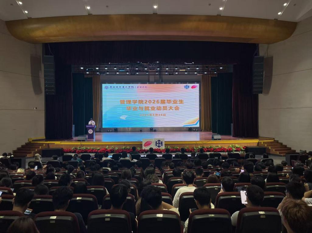 本网讯(记者 邓嘉琪)为帮助管理学院2026届毕业生准确把握当前就业形势,明确实习与就业目标,提升核心竞争力,顺利推进毕业准备工作,管理学院于8月28日在学生活动中心举办2026届毕业生毕业与就业动员大会。学院副院长李岩、党总支副书记戴杰、唯品会校企合作单位代表及全体2026届毕业生班主任、辅导员老师出席本次大会。
