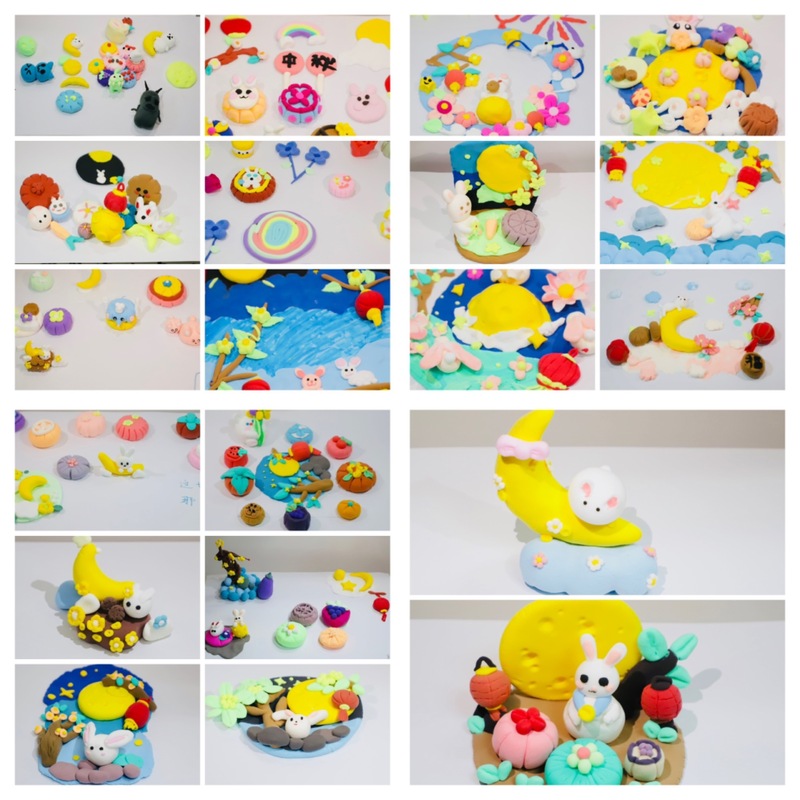 创作环节,工作人员提前准备好彩泥、卡纸与工具,并向大家讲解泥塑基本技巧与中秋经典元素的创作思路。师生们围绕玉兔、月亮、月饼、灯笼等中秋元素展开想象,手指间揉、捏、搓、压等动作娴熟交替,塑封盒中的彩泥变成创意十足的作品:有同学塑出“玉兔攀月”的灵动场景,有同学捏出“圆月映桂”的静谧画面,还有同学创作了寓意团圆的“灯笼桂枝中秋夜”,每一件作品都饱含着对中秋佳节的美好诠释。