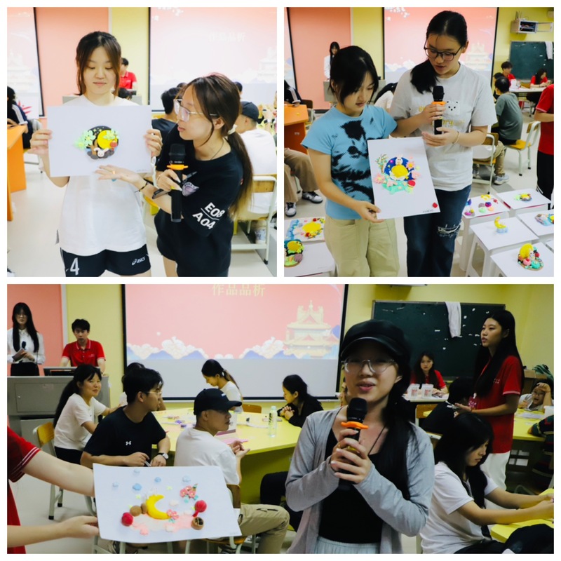 创作结束后,活动进入作品分享环节。各小组纷纷手持自己的泥塑作品走上台前,将创作灵感与藏在心底的中秋记忆娓娓道来。有同学指着自己捏制的“团圆月饼”,分享了每当中秋全家围坐分食月饼、闲话家常的温馨故事,也有同学结合作品中的“玉兔”细节,细致解读了如何通过调整彩泥软硬程度塑造玉兔的形态,展现出对泥塑技艺的学习心得。分享结束后,师生共同评定作品,为喜爱的作品投出了宝贵一票。