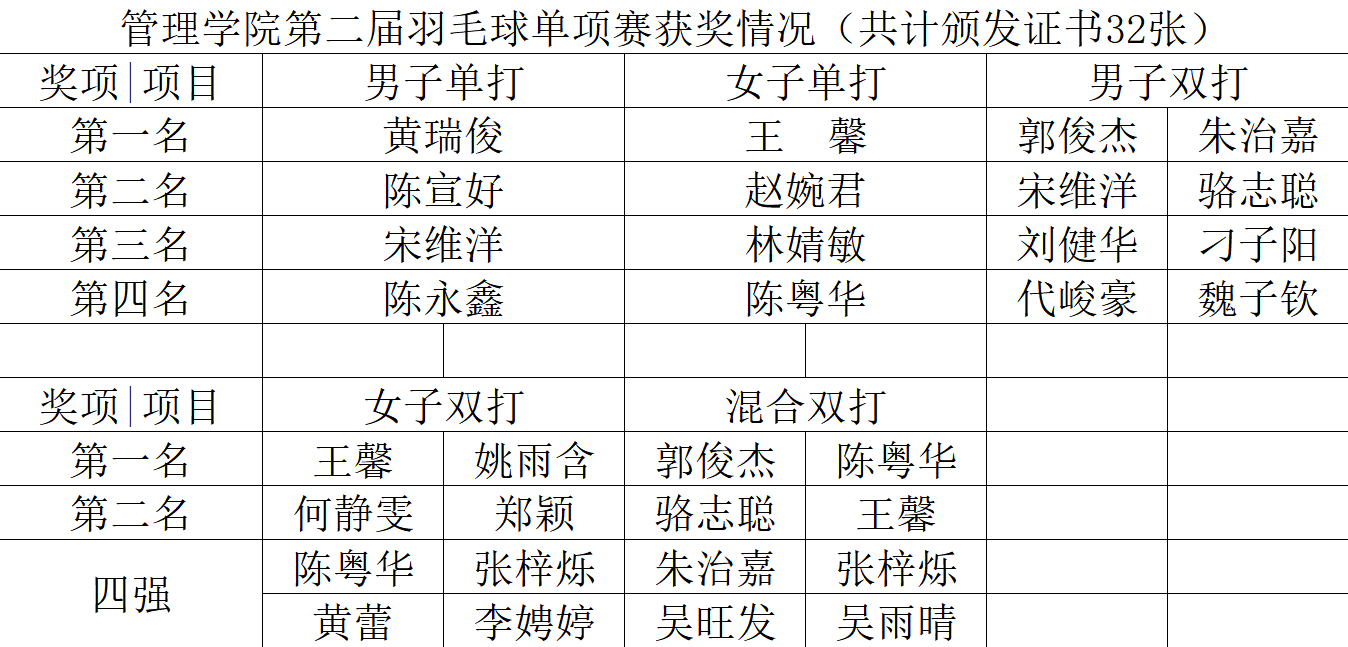 此次羽毛球单项赛的圆满落幕,不仅为学院学子搭建了展示自我、切磋技艺的优质平台,更极大丰富了校园文化生活,凝聚了班级向心力。未来,管理学院将继续秉持服务同学理念,举办更多喜闻乐见的体育赛事,引导全院学子在强健体魄、增强意志的同时,培养团结协作、勇攀高峰的优秀品质,以更加强健的体魄、更加饱满的精神状态投入到学习和生活中,共同书写学院体育事业与综合素质教育的新篇章。